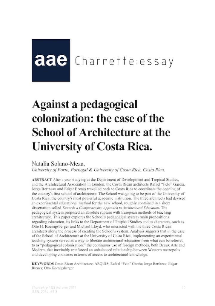 Solano-Meza, Natalia, Against a pedagogical colonization: The case of the School of Architecture at the University of Costa Rica, Journal: Charrette, The Journal of Architecture Educators, Autumn, 2017, pages 40-58.